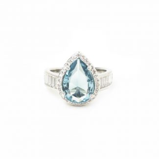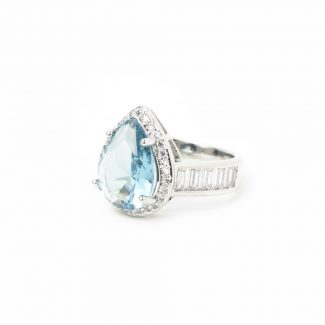 Anillo con piedra preciosa color aguamarina en lágrima, rodeada de brillantes y sortija con brillantes en baguettes
