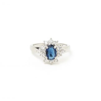 Piedra central azul zafiro acompañada de puntas de brillantes talla diamantes. Sobre rodio bañado en plata.