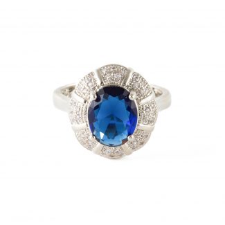 Piedra semi preciosa color azul zafiro acompañada de cristales talla diamantes.