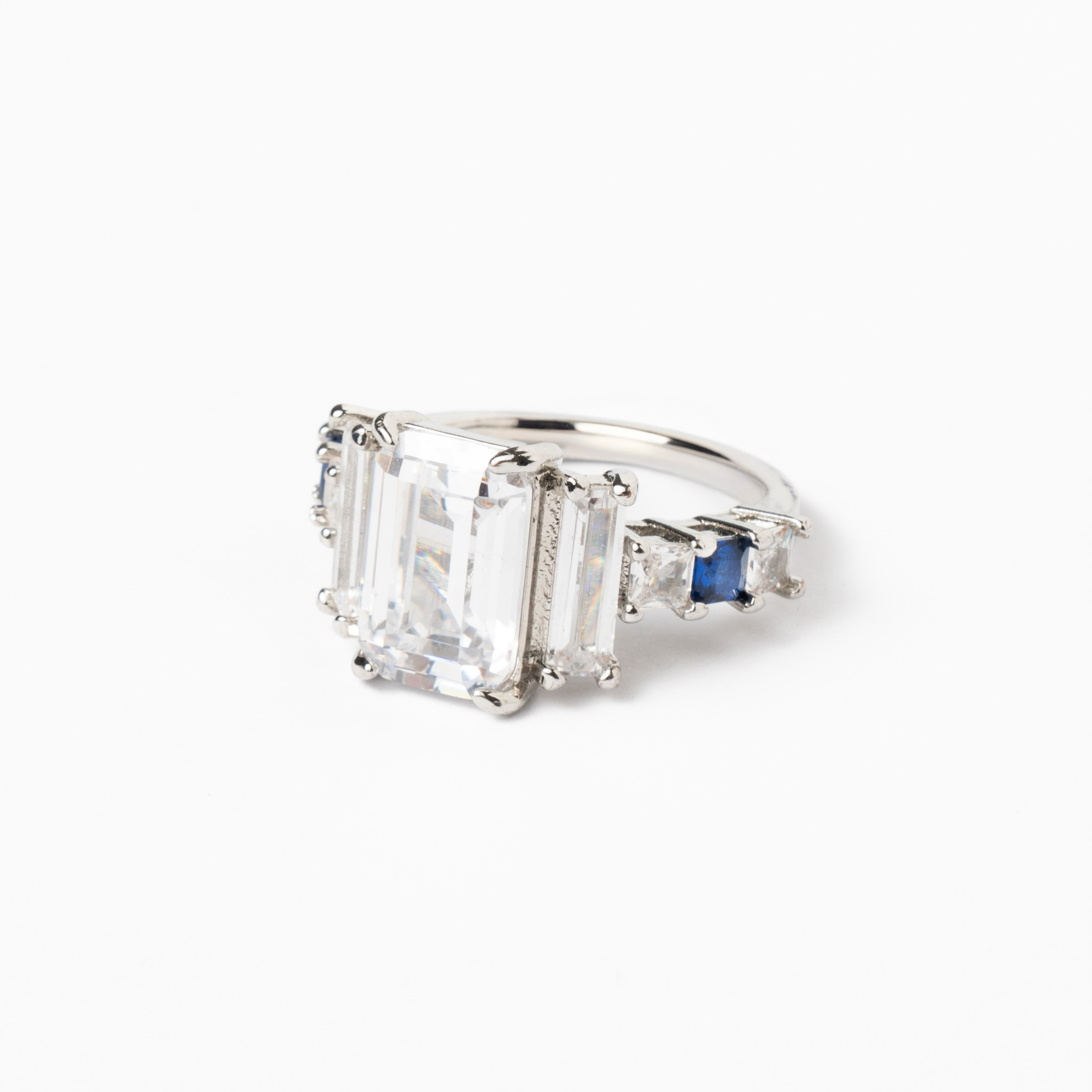 Pieza compuesta por tres anillos, sobre rodio bañado en plata. Diferentes tamaños de billantes talla diamante y una piedra central con mayor importancia.