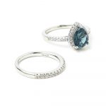 El modelo Aqua esta compuesto por una piedra central el color aguamarina rodeada de puntas de brillantes. La acompaña un rivier de brillantes.