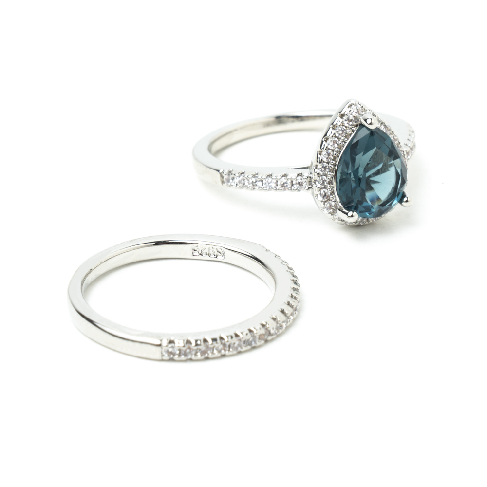 Anillo con piedra preciosa color aguamarina sobre rodio bañado en plata.
