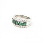 Anillo de piedras preciosas transparentes y piedra central esmeralda.