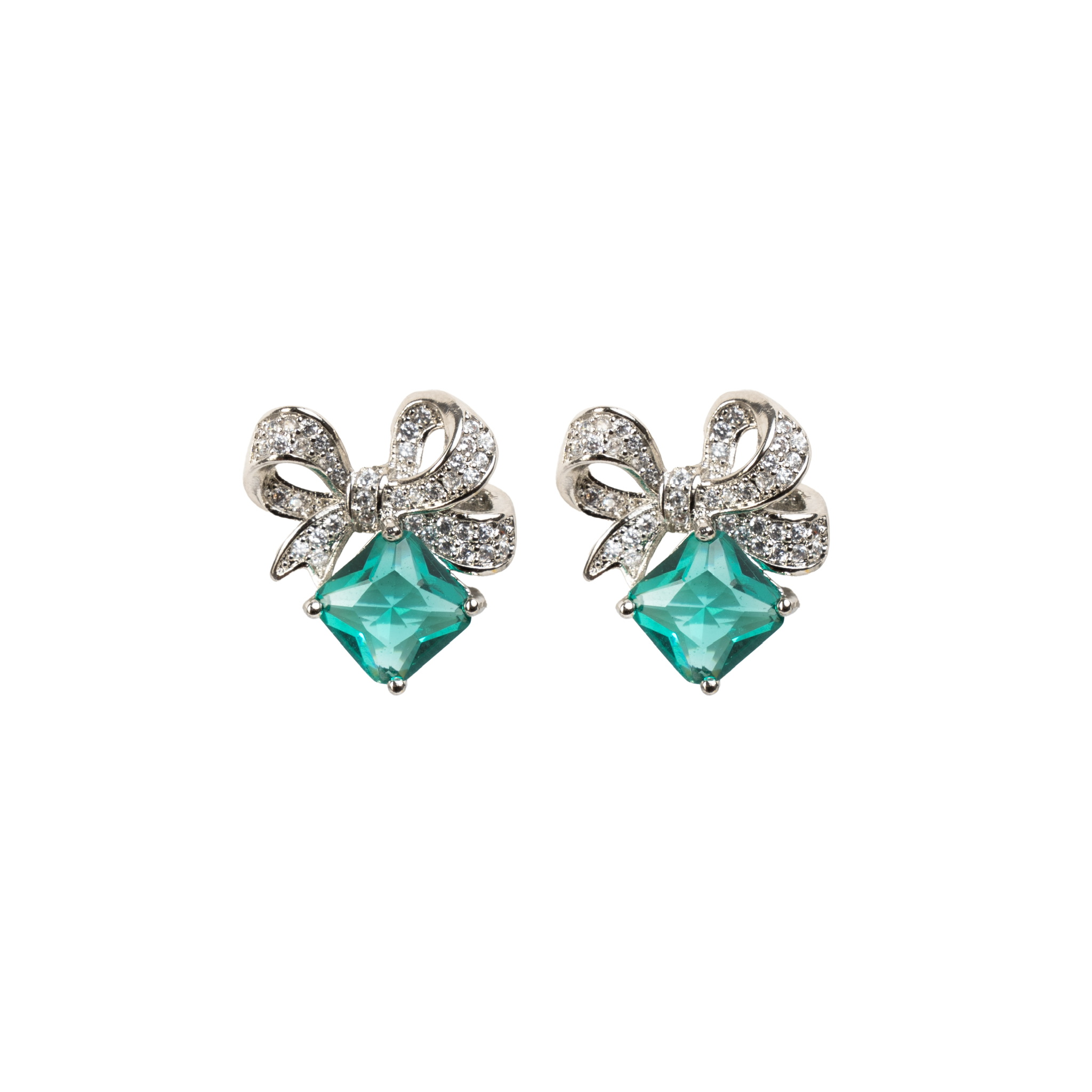 Pendientes lazo de brillantes y piedra esmeralda en rombo.
