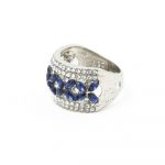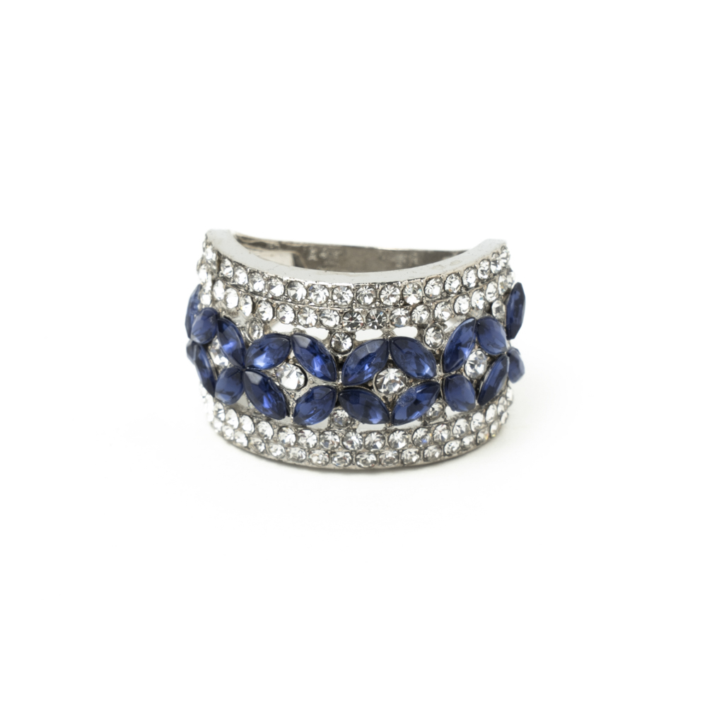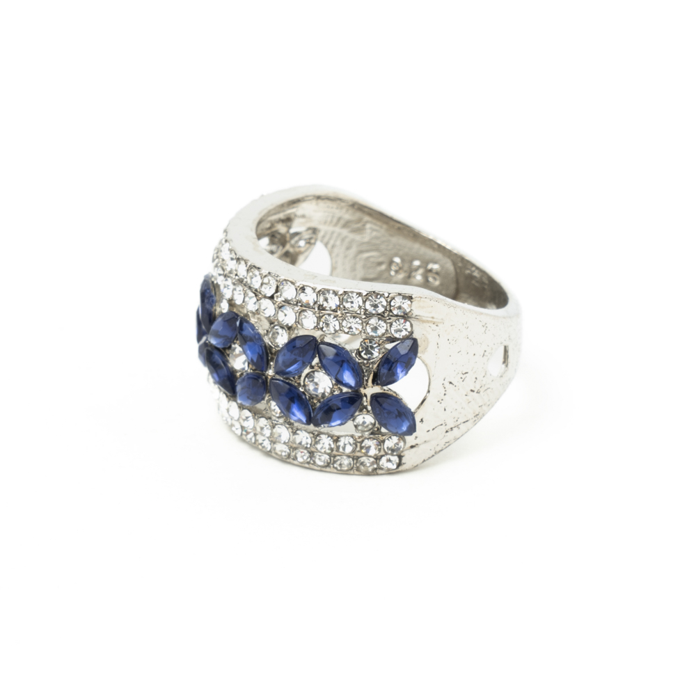 Piedras semi preciosas formando una flor, acompañada de puntas de brillantes. Una pieza romántica y muy especial. Rodio bañado en plata.