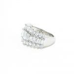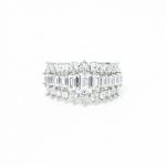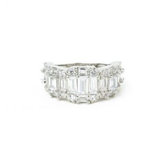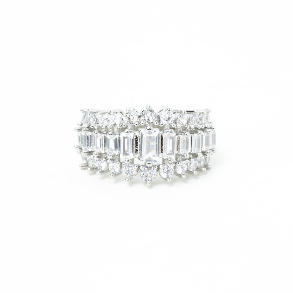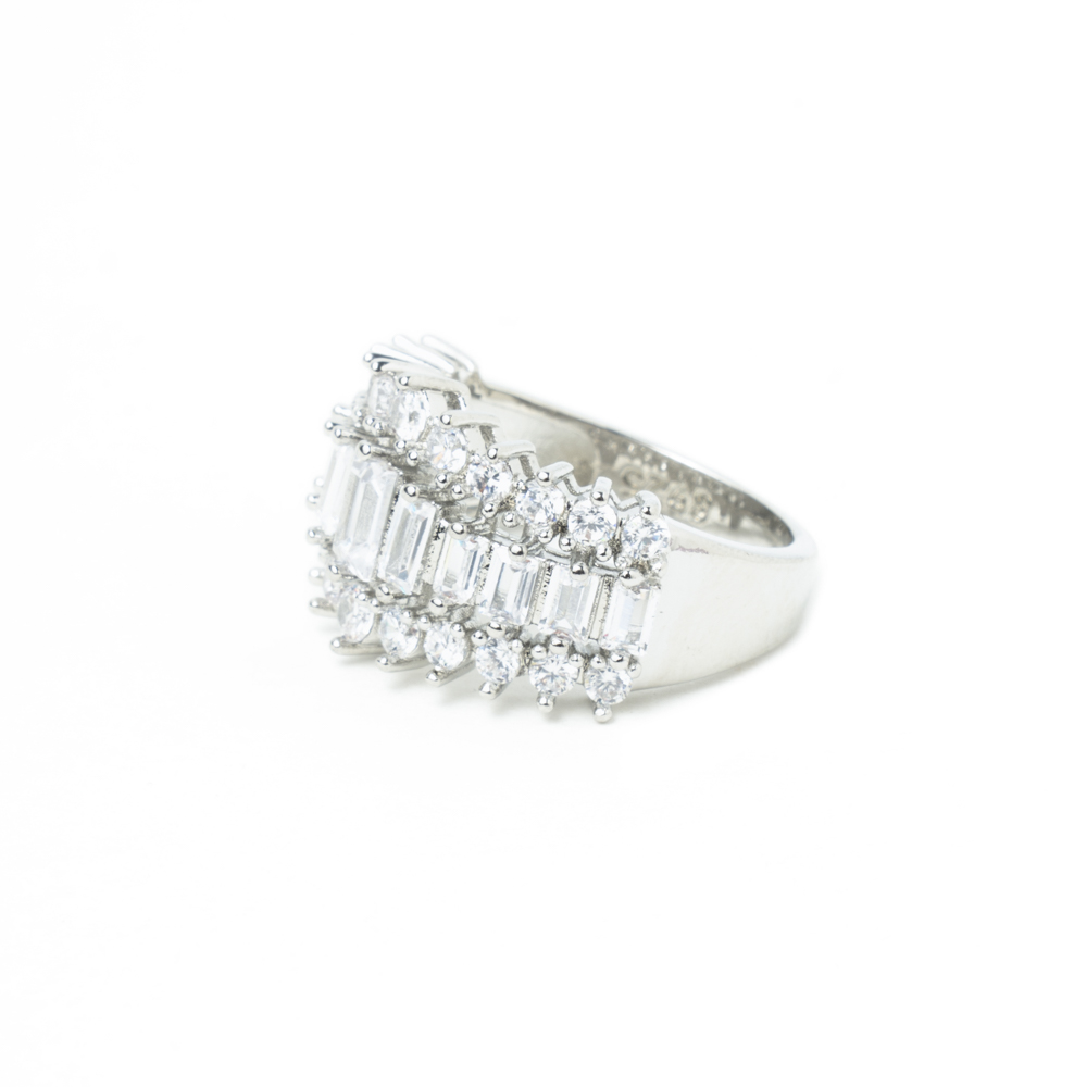 Una pieza clásica compuesta por diamantes talla brillantes y tamaño baguete sobre rodio bañado en plata.
