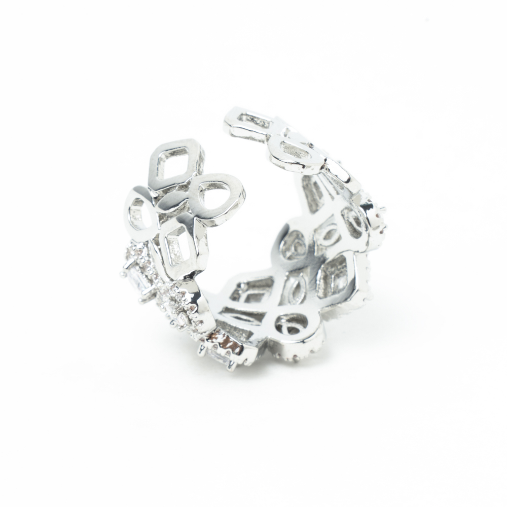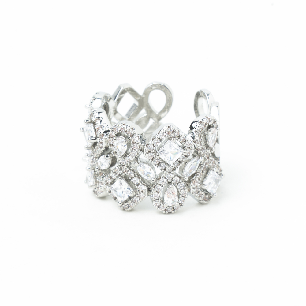 Diamantes en forma de lagrima y cuadrados rodeados por puntas de brillantes sobre rodio bañado en plata. Una pieza de talla única con muchísima personalidad.