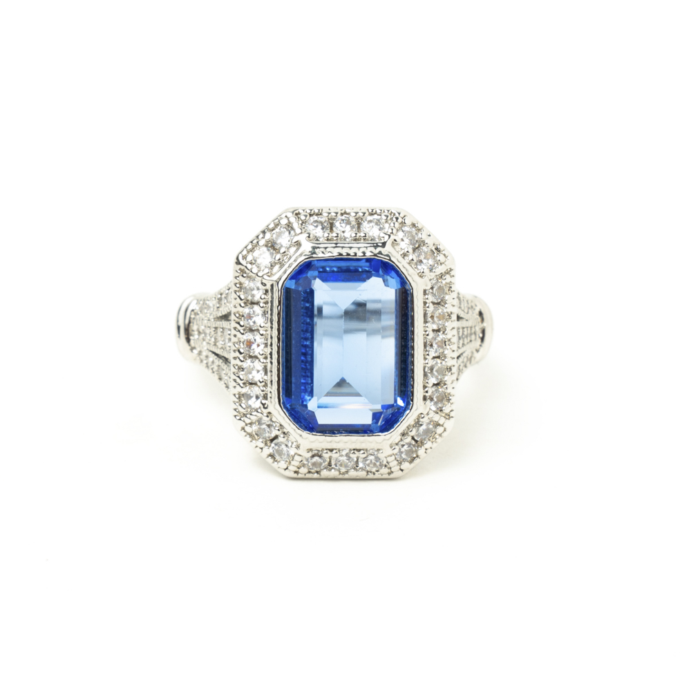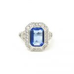 Preciosa piedra semi preciosa en color azul zafiro acompañada de diamantes talla brillantes.