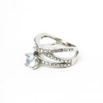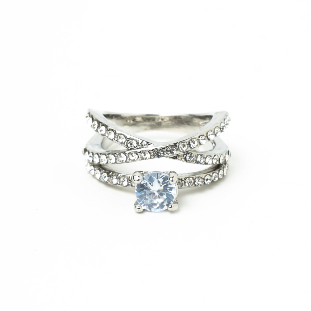 Piedra central semi preciosa acompañada de puntas de brillates sobre varias monturas. Rodio bañado en plata.