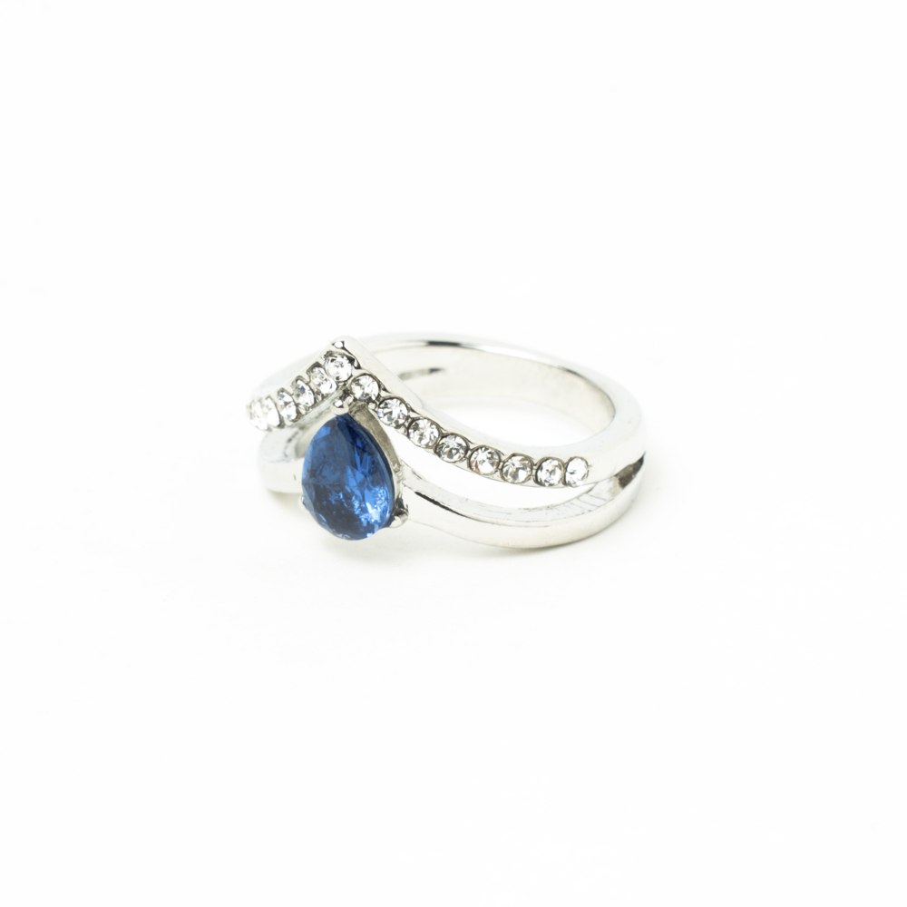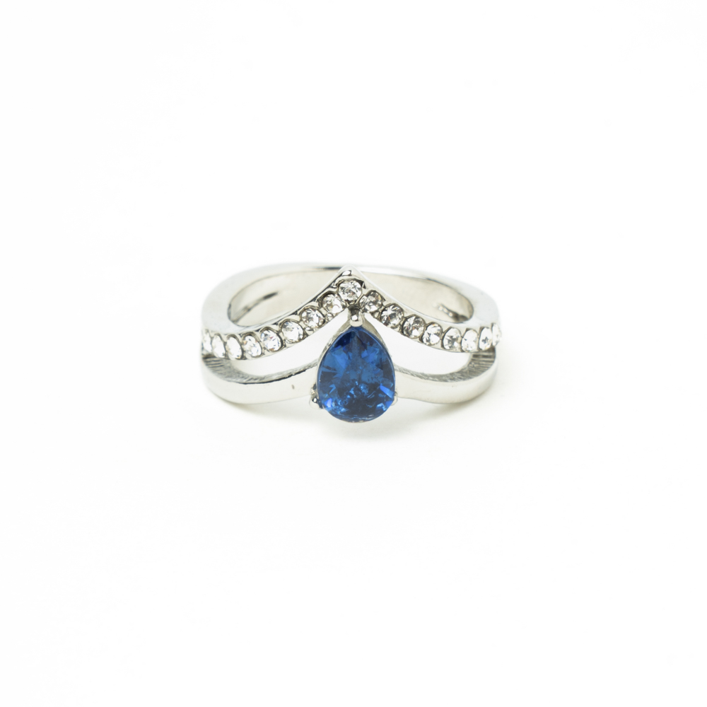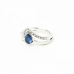 Anillo con piedra preciosa color azul zafiro, rodeada de brillantes en forma de lágrima. Rodio bañado en plata.