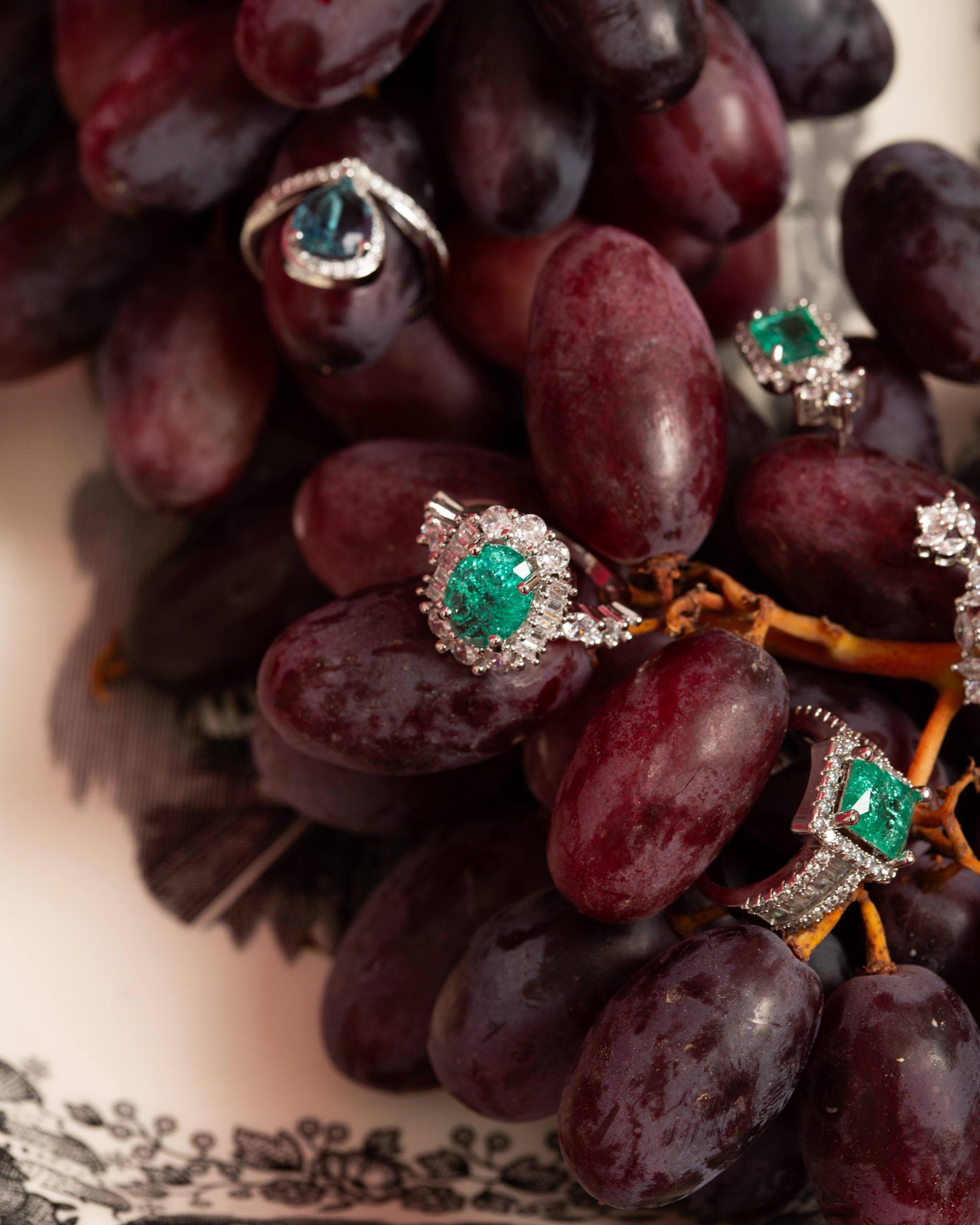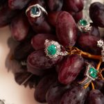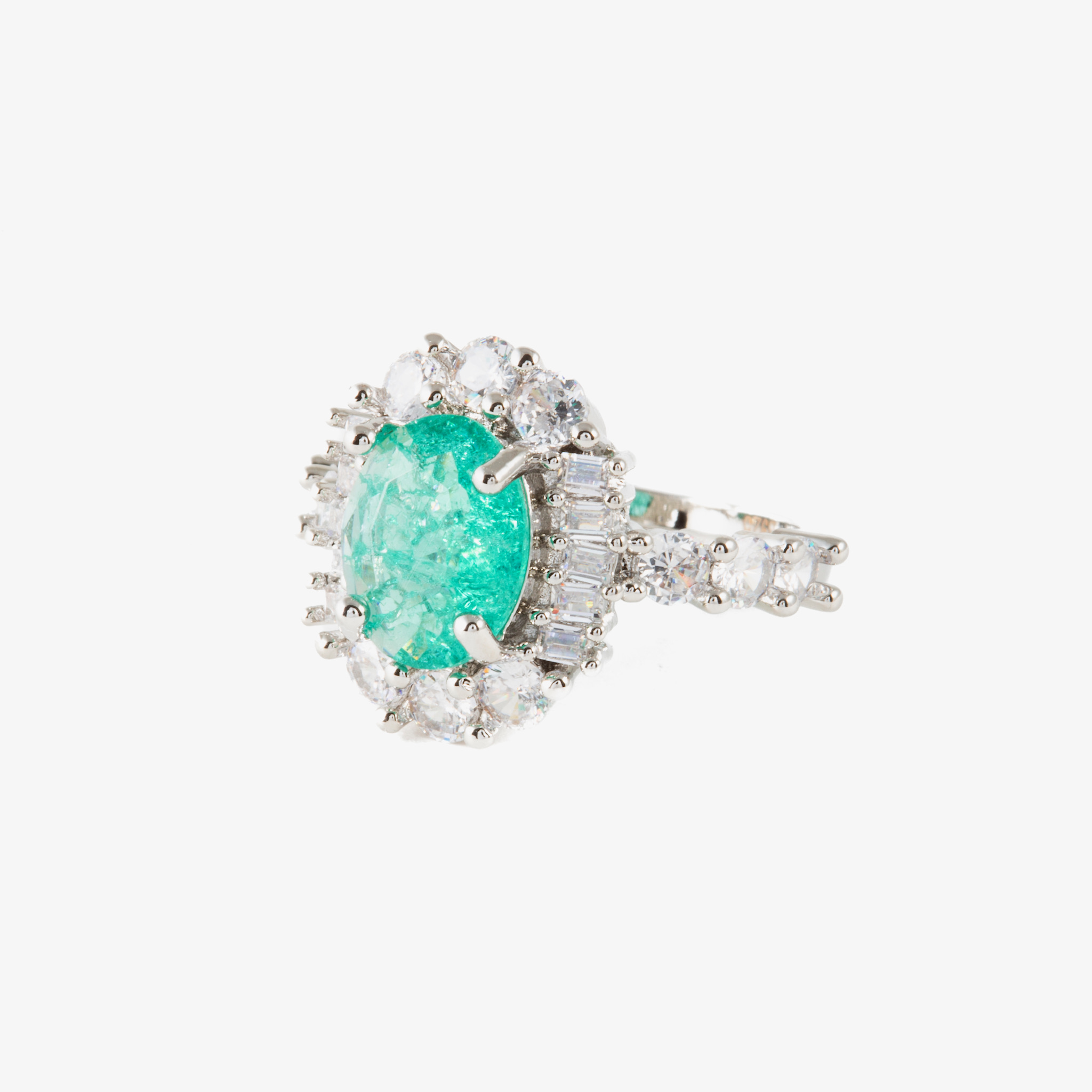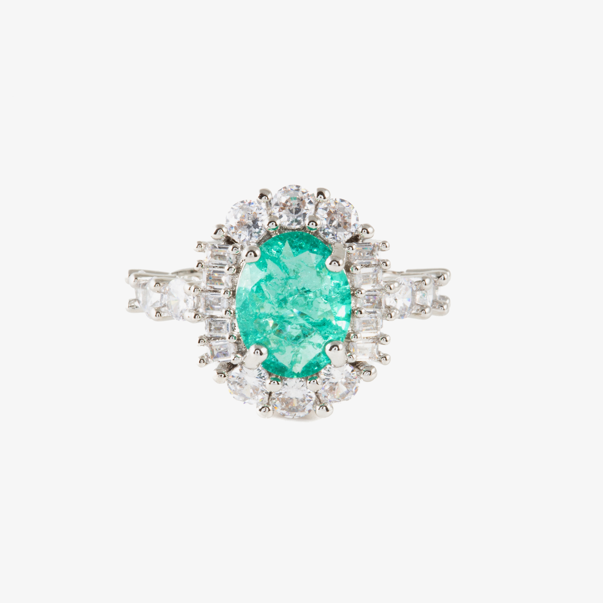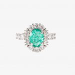 Anillo con piedra esmeralda en forma ovalada, rodeada por diamantes.