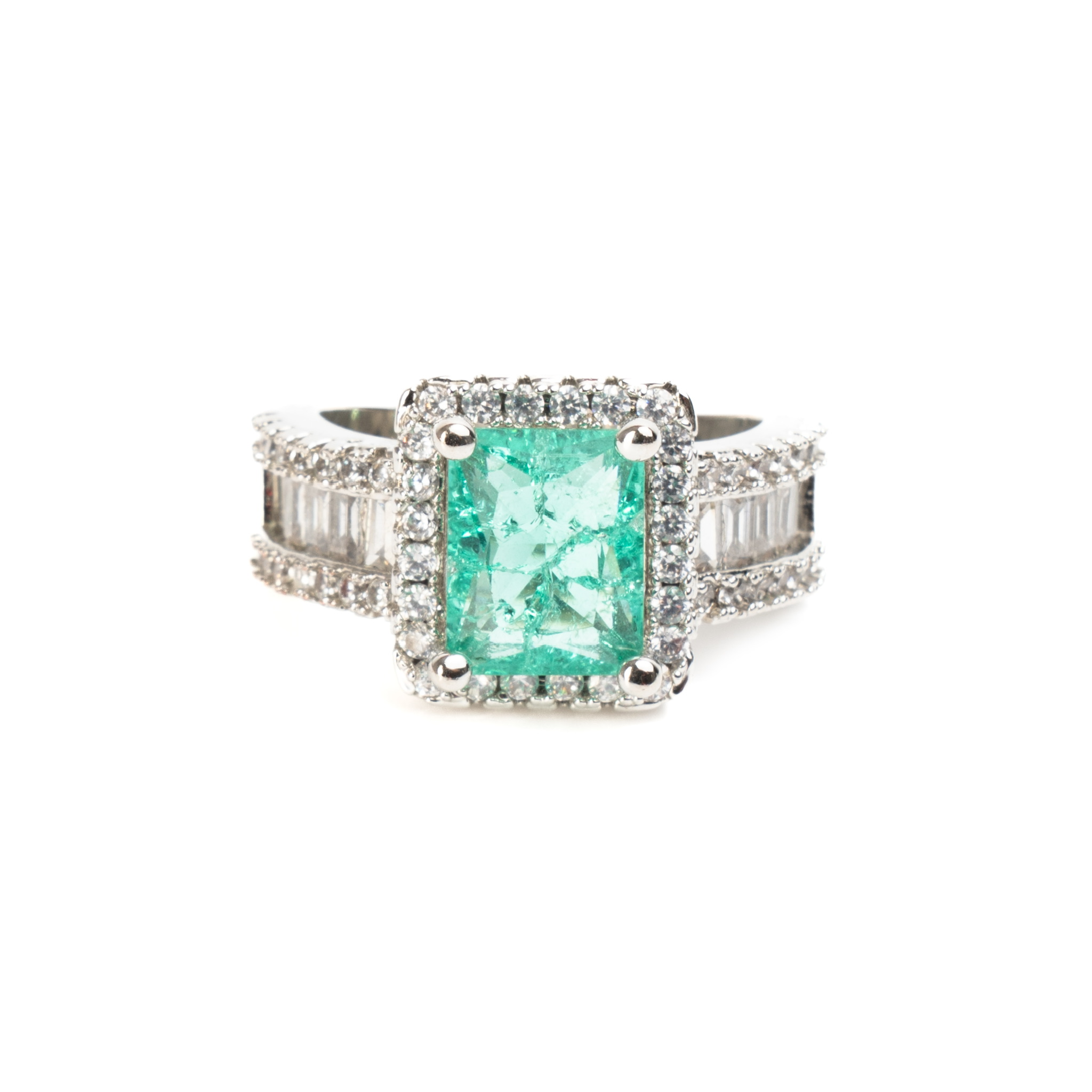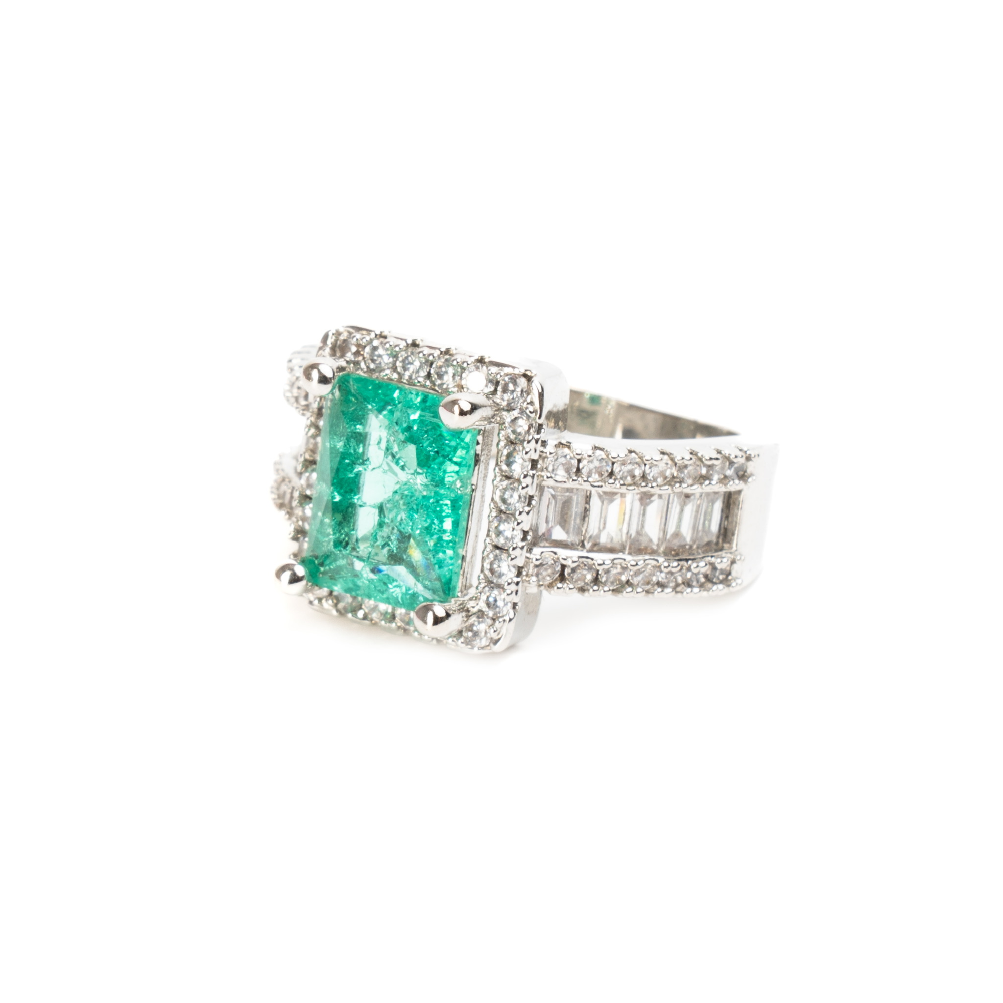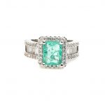 Anillo con gran piedra preciosa esmeralda cuadrada, enmarcada en brillantes y sortija de brillantes en baguette.