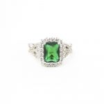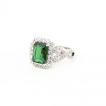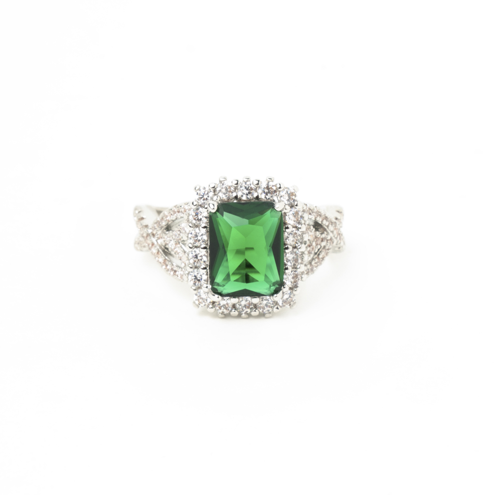 Pieza compuesta por tres anillos, sobre rodio bañado en plata. Diferentes tamaños de billantes talla diamante y una piedra central con mayor importancia.