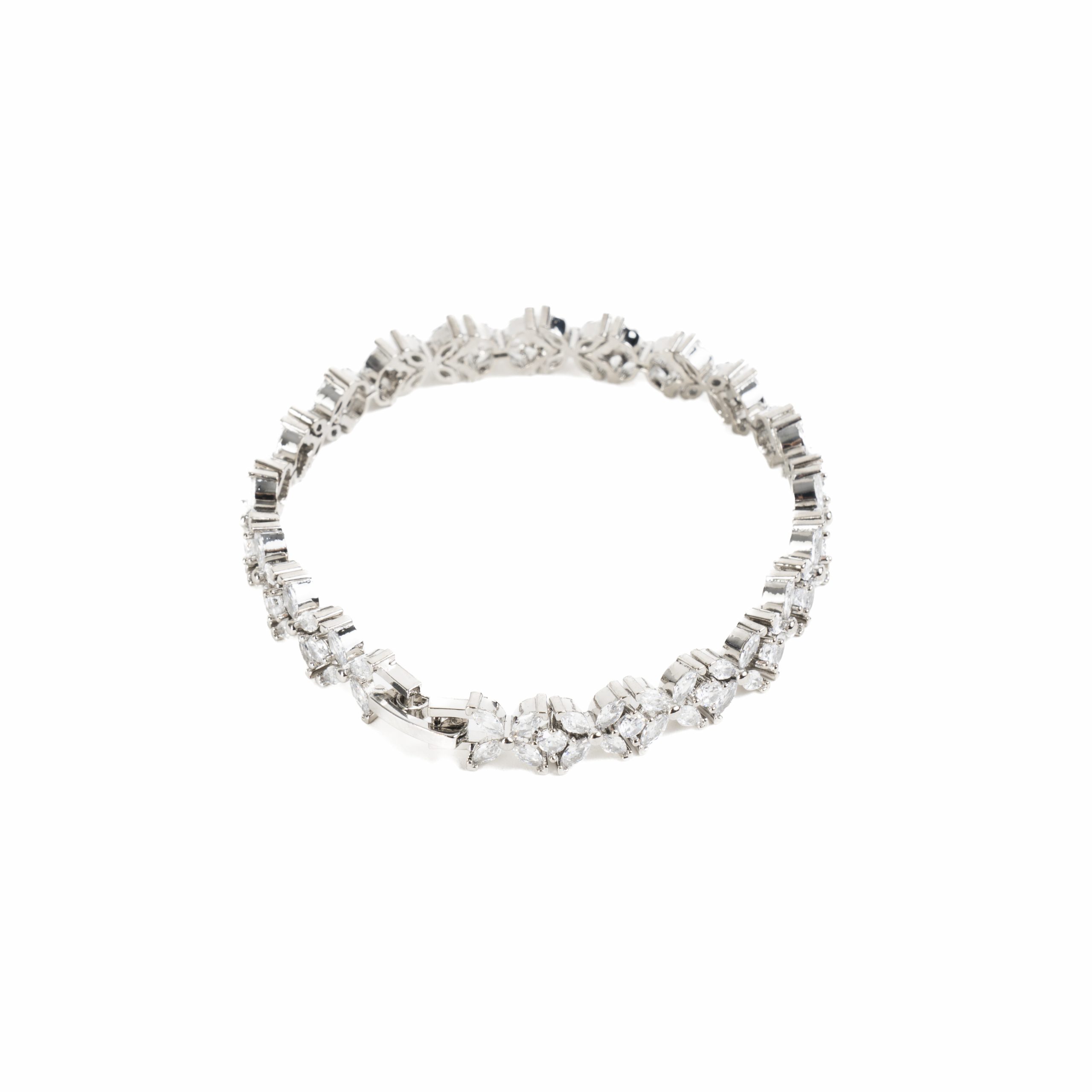Diamantes en forma de lagrima y cuadrados rodeados por puntas de brillantes sobre rodio bañado en plata. Una pieza de talla única con muchísima personalidad.