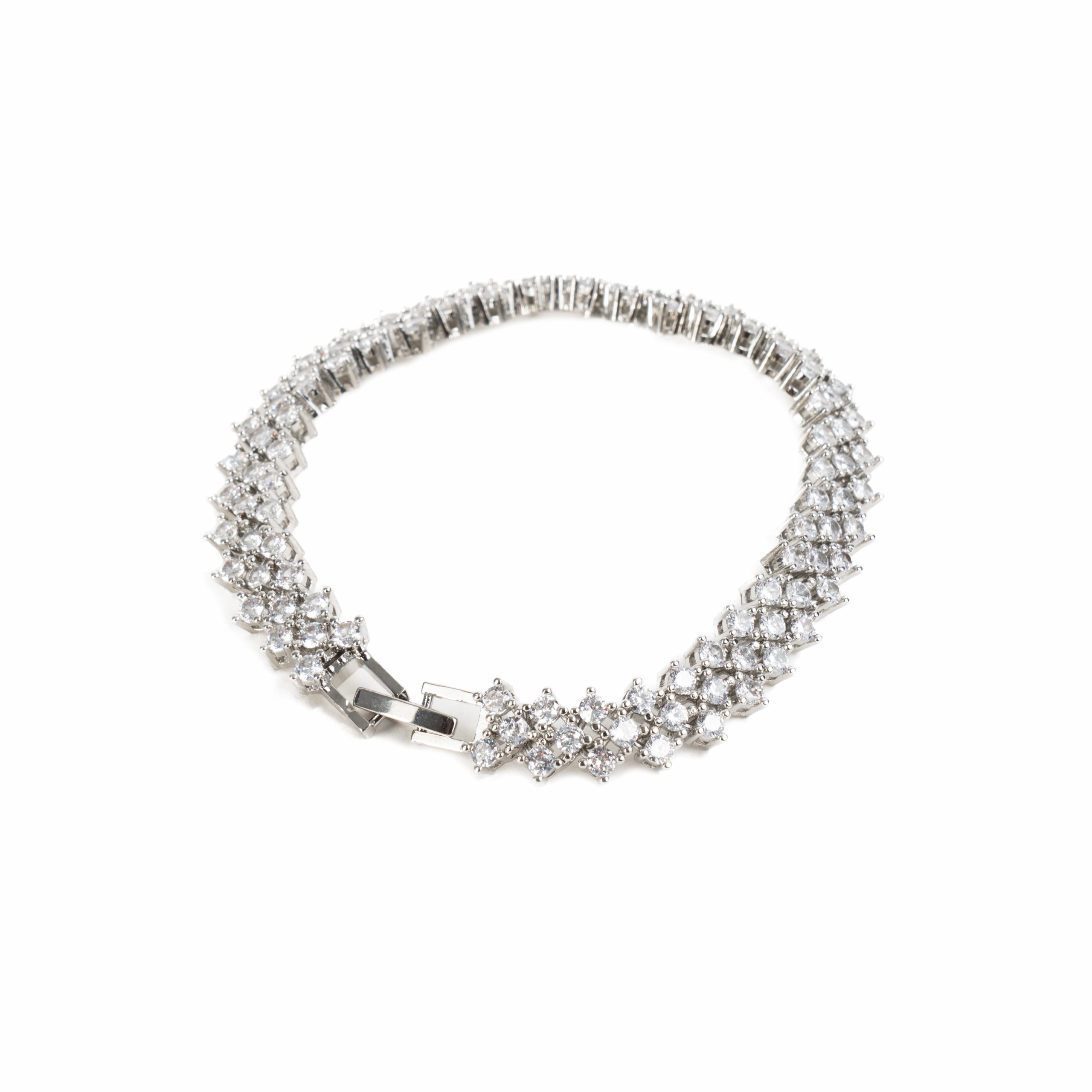 Diamantes en forma de lagrima y cuadrados rodeados por puntas de brillantes sobre rodio bañado en plata. Una pieza de talla única con muchísima personalidad.