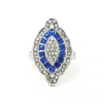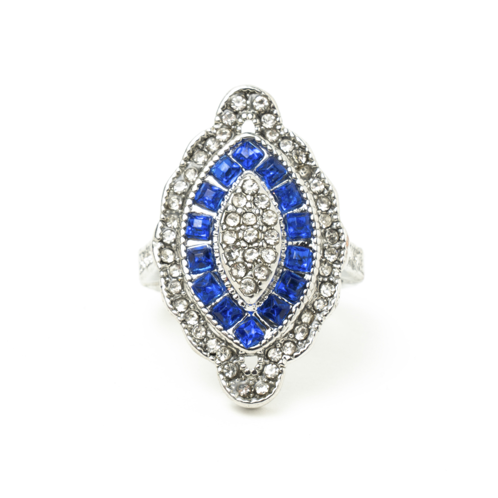 Piedra central azul zafiro acompañada de puntas de brillantes talla diamantes. Sobre rodio bañado en plata.