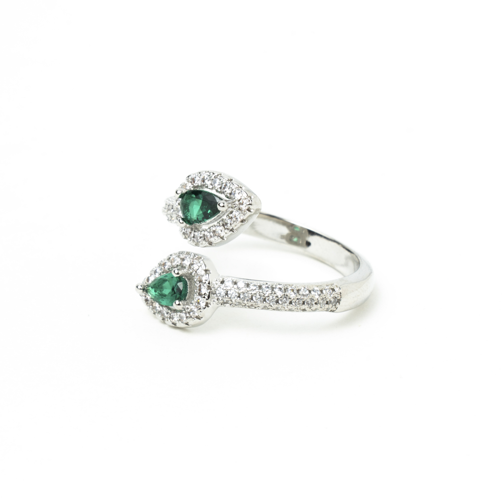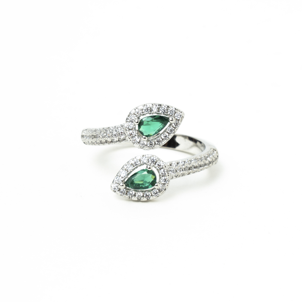 Anillo con piedra preciosa color esmeralda, rodeada de brillantes en forma de lágrima. Rodio bañado en plata.