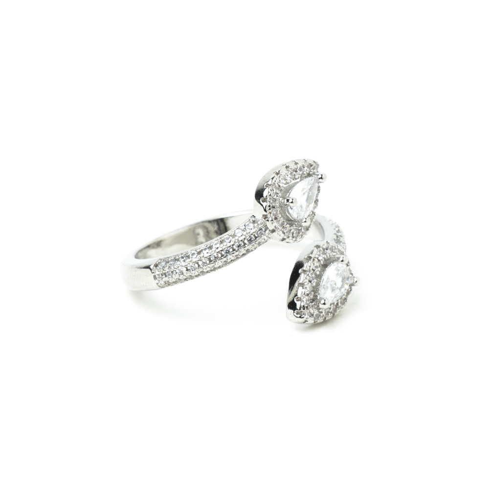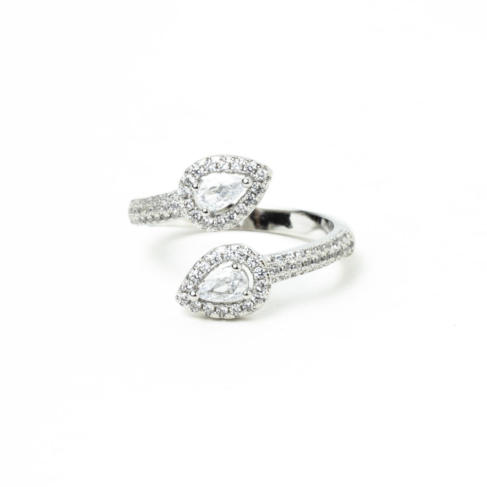 Dos diamantes talla diamantes en forma de lagrima acompañado de puntas de brillantes sobre rodio bañado en plata.