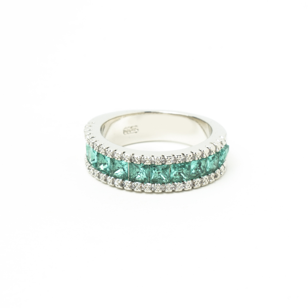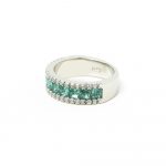 Piedras semi preciosas color verde aguamarina acompañada de puntas de brillantes sobre anillo de rodio ballado en plata.